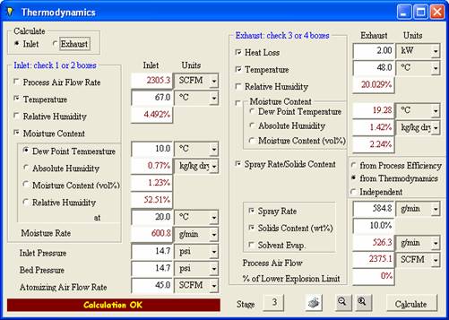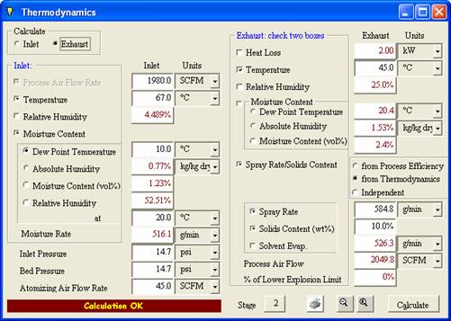 Using the heat loss calculated above and the atypical exhaust temperature of 48°C, the thermodynamics analysis below shows the actual process air flow for the atypical process was 300 SCFM higher.  The impact of this change in the air flow rate is shown in the hydrodynamics analysis below using the new pressure drop.