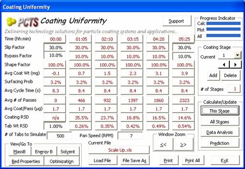 Enter the process conditions in PCTSUni to determine coating uniformity as shown below.  The pan speed to 7 RPM is used as the first guess.