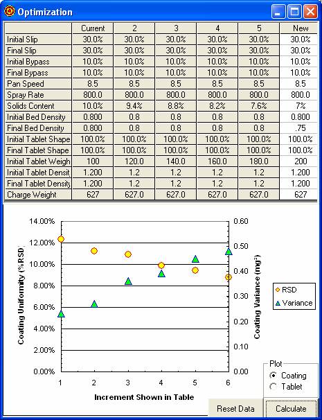PCTSUni has the following optimization screen to examine the effects of changes to multiple variables on coating uniformity.  Here, the effects of changing solids content, final bed density, and initial tablet weight on coating uniformity can be seen.